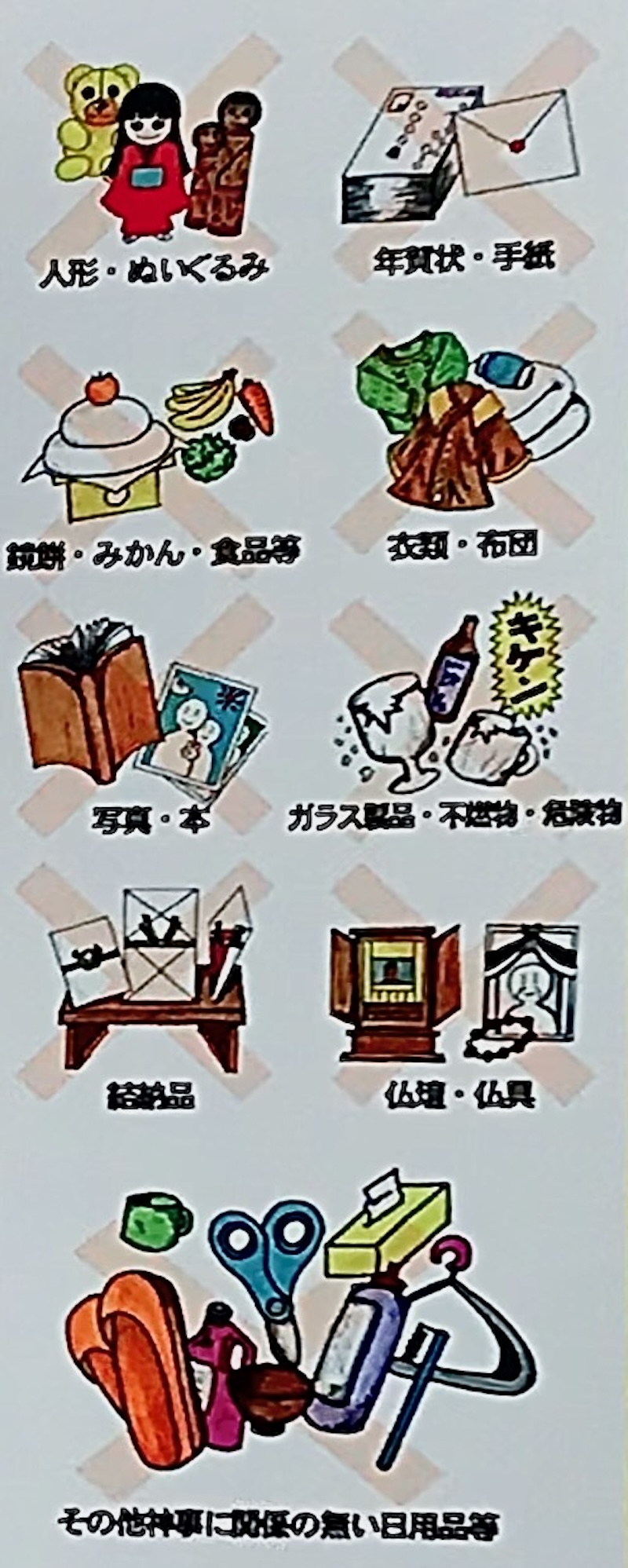 その他、神社頒布のものでも燃えない素材のもの(金属製・陶器製・プラスチック製・石製)は不可。